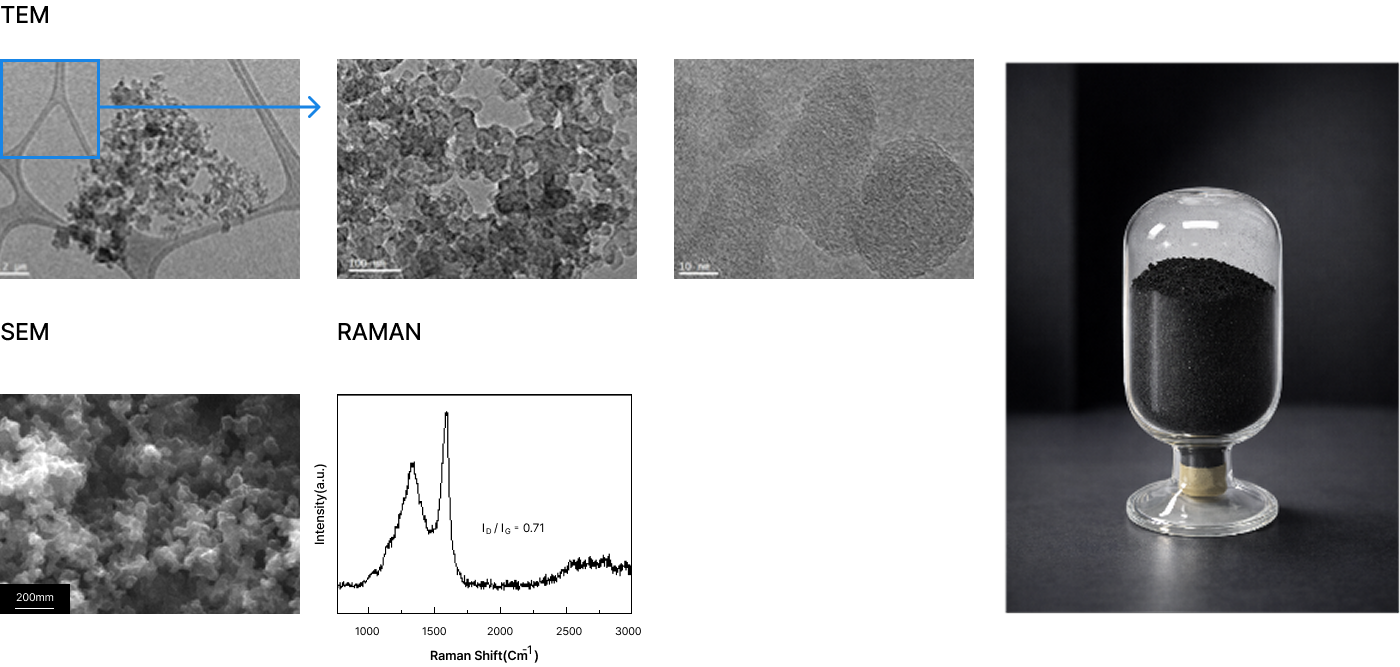 일반 연소 기반 카본블랙 대비 불순물 함량이 낮고, 입자 크기와 기공 구조 제어가 용이하여 기능성 탄소 소재로의 활용 가능성이 높습니다.